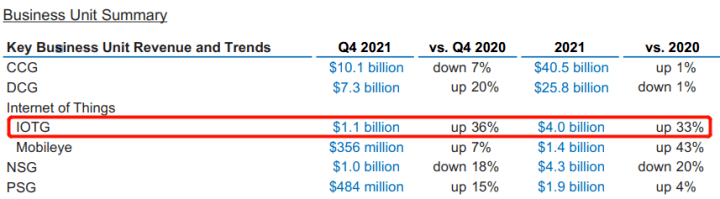 在晶圓代工巨頭臺積電公布的財報中,2021年其手機業(yè)務營收首次被HPC(大型高性能計算)業(yè)務超越,面向汽車板塊的營收和訂單需求也猛增。 圖像傳感器芯片設計龍頭韋爾股份最新財報顯示,其半導體業(yè)務收入同比增長18%,雖然智能手機CMOS占據(jù)營收大頭,但業(yè)績增長主要來源于車載CIS與安防CIS,尤其在安防領域?qū)崿F(xiàn)高達60%的業(yè)績增長。 2021年物聯(lián)網(wǎng)事業(yè)部(IoTG)成為國際半導體巨頭英特爾增長最快的業(yè)務,同比增長33%,同時汽車自動駕駛業(yè)務也增速驚人,反觀主營PC終端的CCG部門業(yè)績僅增1個百分點。